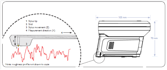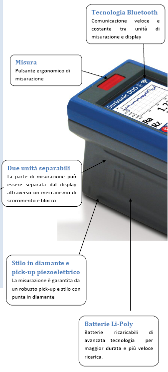 Lo strumento è equipaggiato con uno stilo in diamante che va a contatto delle parti da testare. La movimentazione avviene per mezzo di un traslatore motorizzato di precisione. L’escursione verticale dello stilo è controllata da un pick-up ad elevata sensibilità. Il segnale elettrico rilevato viene digitalizzato e gestito da un microprocessore che all’istante fornisce tutti i parametri calcolati durante la misurazione.Mini USB caricabatterie