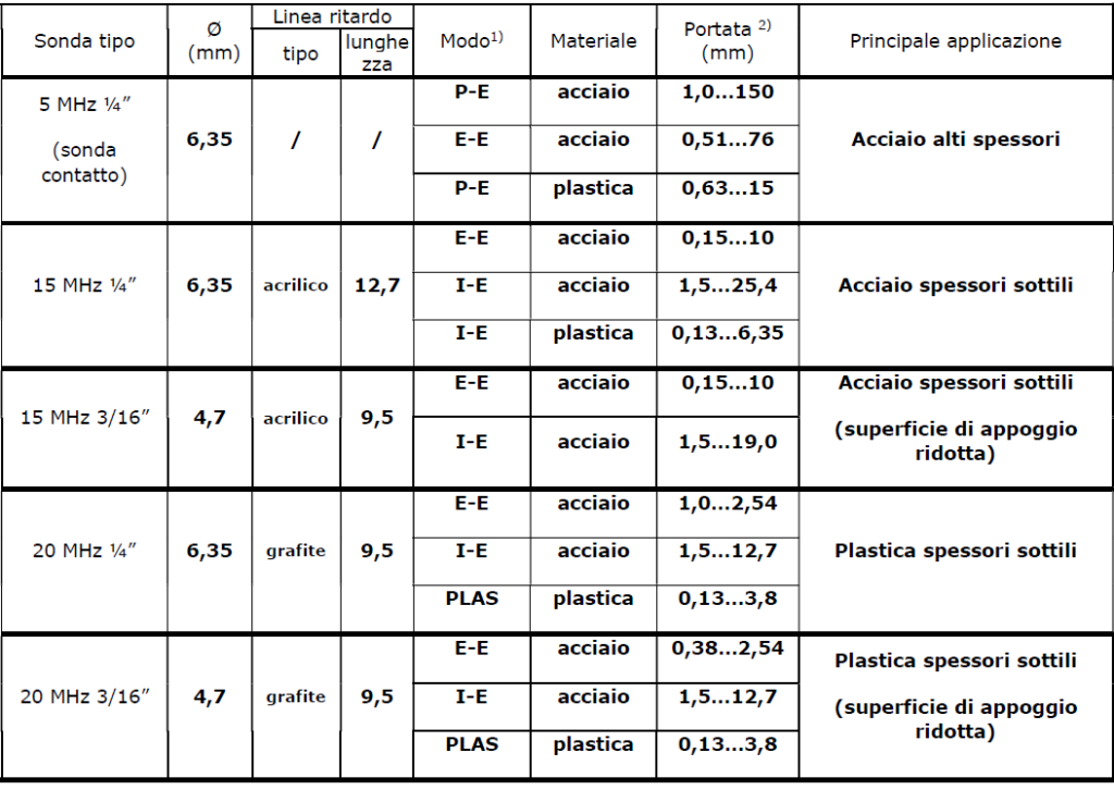 2) La portata delle sonde è in funzione del materiale da controllare e della finitura superficiale. I riferimenti in tabella sono stati rilevati sulla base di acciaio comune 4340 e per plastiche comuni.